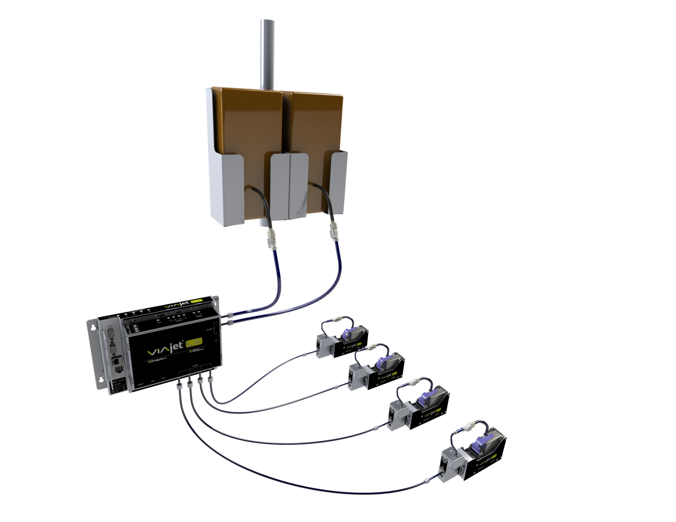 De plus, les têtes d’impression peuvent être positionnées à différentes orientations ou même à différentes hauteurs tout en restant connectées au même ABIS.